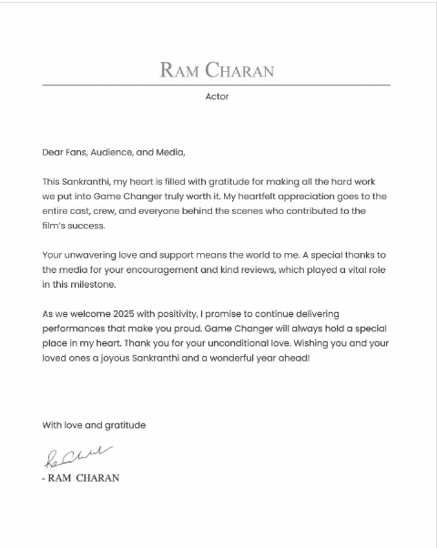 14 जनवरी को, राम चरण ने फ़िल्म की सफ़लता का जश्न मनाते हुए प्रशंसकों को एक भावपूर्ण नोट के साथ संबोधित किया। उन्होंने दर्शकों, कलाकारों, क्रू और मीडिया के प्रति उनके समर्थन के लिए आभार व्यक्त किया। उन्होंने पोस्ट में लिखा, “आपका अटूट प्यार और समर्थन मेरे लिए बहुत मायने रखता है। गेम चेंजर हमेशा मेरे दिल में एक ख़ास जगह रखेगा।”