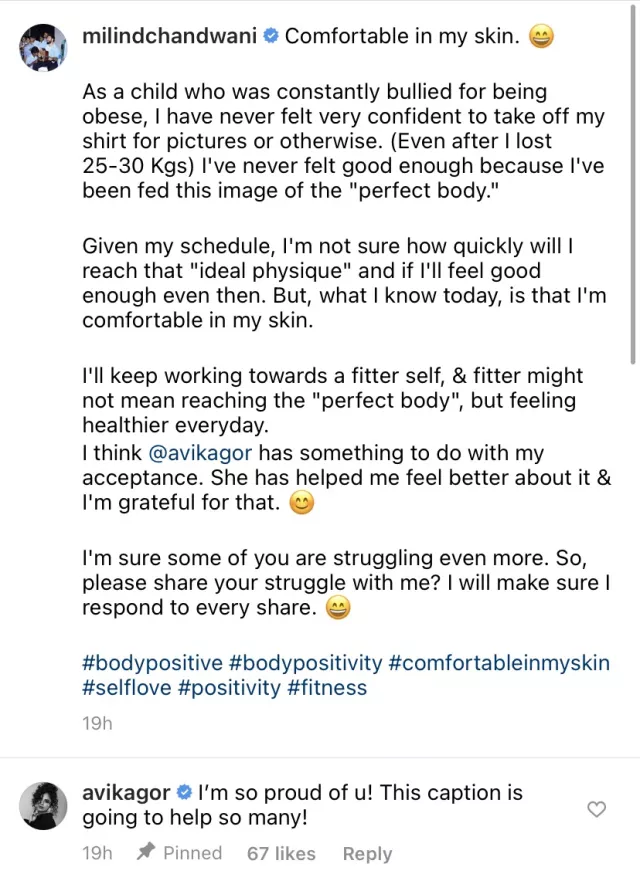 इससे पहले, मिलिंद चंदवानी ने अपने इंस्टाग्राम पर अविका के साथ मालदीव छुट्टियों की एक तस्वीर शेयर की थी। फोटो में वे समुद्र के किनारे अपनी बॉडी फ्लेक्स करते नजर आ रहे थे। उन्होंने एक लंबा नोट भी लिखा, जिसमें बताया कि कैसे अब वे अपनी त्वचा में सहज महसूस करते हैं। मिलिंद ने यह भी बताया कि वे कभी नहीं सोचते थे कि वे ‘आदर्श काया’ पा सकेंगे, लेकिन अविका ने उन्हें अपने शरीर को उसी रूप में स्वीकारने के लिए प्रेरित किया।