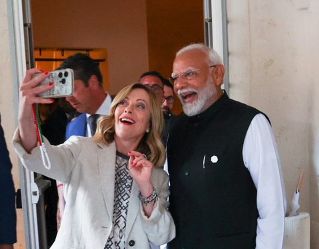 इटली की प्रधानमंत्री जॉर्जिया मेलोनी ने अपुलिया में जी-7 शिखर सम्मेलन के दौरान प्रधानमंत्री नरेंद्र मोदी के साथ सेल्फी ली। इटली के प्रधानमंत्री ने मोदी का नमस्ते के साथ स्वागत किया और दोनों ने एक दूसरे का अभिवादन किया।