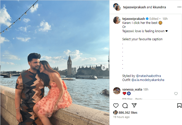इस समय यह जोड़ा लंदन में छुट्टियाँ मना रहा है और उन्होंने गुरुवार को सोशल मीडिया पर कुछ नई तस्वीरें भी शेयर कीं। इंस्टाग्राम पर दोनों ने एक कोलाब पोस्ट में लिखा, “करण: मैंने उसे सबसे अच्छी तस्वीरें खींची हैं” या “तेजस्वी: प्यार का मतलब है पहचानना। अपना पसंदीदा कैप्शन चुनें।” यह पोस्ट उनके ब्रेकअप की अफवाहों के बाद आई है।
