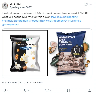 एक यूजर ने घर में रखे कैरामेलाइज्ड पॉपकॉर्न के आखिरी पैकेट की तस्वीर साझा की और मजाक में लिखा कि वे इसे जीएसटी के कारण बढ़ी हुई कीमतों से पहले खत्म कर देंगे। - “लक्जरी आइटम” की घोषणा: