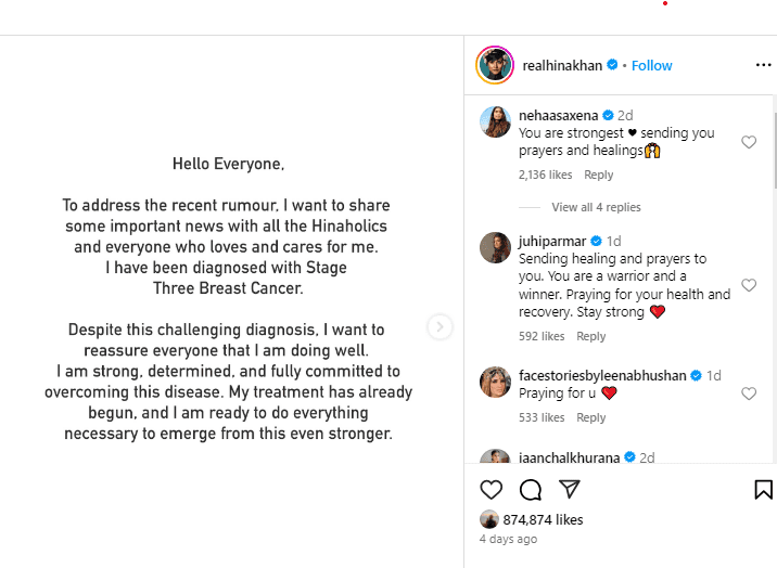 हिना खान अपनी स्थिति को बहुत सकारात्मकता के साथ साझा कर रही हैं और उन्हें इंडस्ट्री के सहकर्मियों और प्रशंसकों का बहुत समर्थन मिल रहा है।