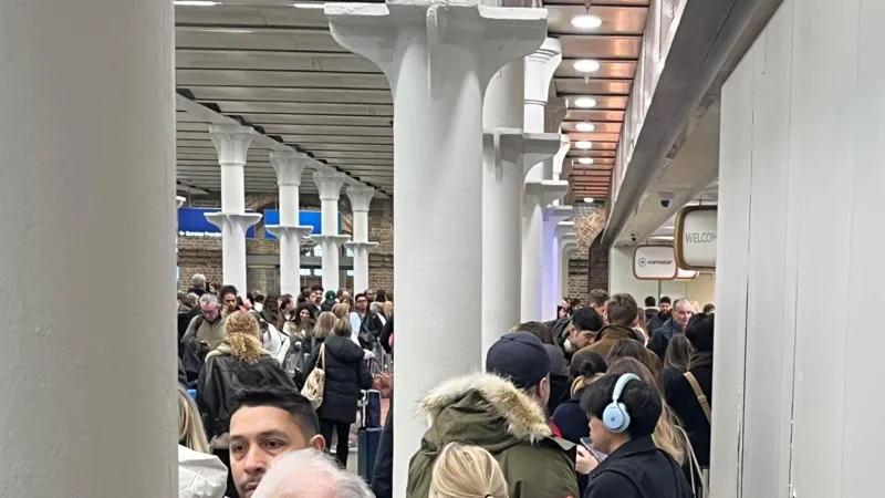 लंदन के सेंट पैनक्रास ट्रेन स्टेशन पर सुबह 08:30 GMT से ही यात्रियों की लंबी कतारें लग गई थीं, क्योंकि लोग यह जानने की कोशिश कर रहे थे कि वे अपनी यात्रा कैसे जारी रखें।