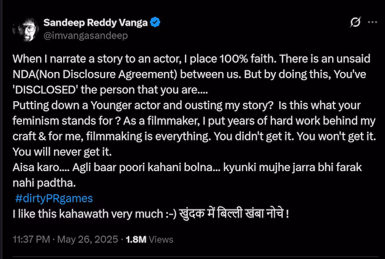 वांगा ने आगे उस अभिनेता के “Dirty PR Games” को उजागर करते हुए लिखा कि वह इस बात की बिल्कुल भी परवाह नहीं करते कि फिल्म की कहानी उजागर हुई है। उनके लिए फिल्म निर्माण एक पवित्र प्रक्रिया है, जिसे वह वर्षों की मेहनत और समर्पण से निभाते हैं।