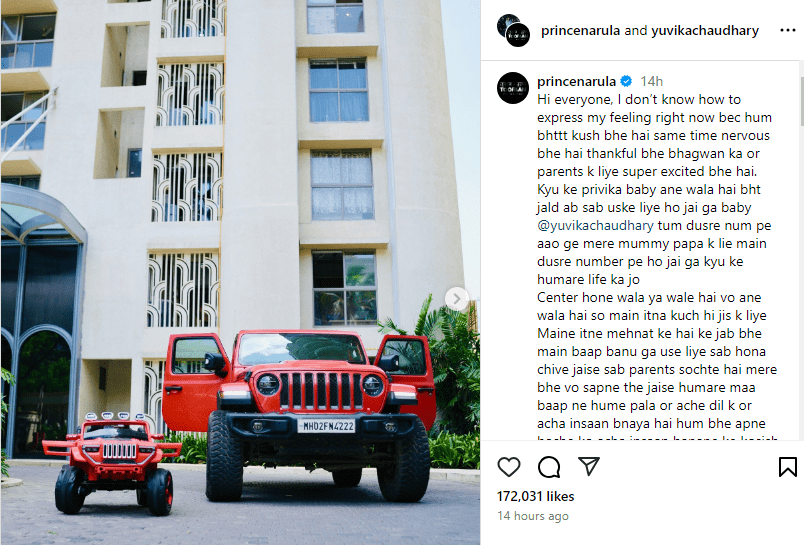 उन्होंने एक तस्वीर शेयर की जिसमें उनकी कार के बगल में एक लाल खिलौना कार रखी हुई है। प्रिंस नरूला ने कैप्शन में लिखा, “बेबी आने वाला है जल्दी।” उन्होंने अपनी पत्नी के प्रति आभार जताते हुए कहा कि उन्हें यह “सबसे अच्छा उपहार” मिला है।