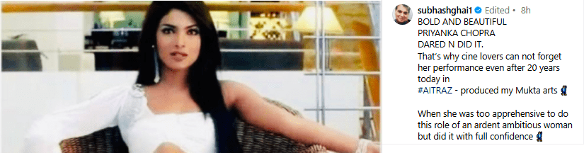 फिल्म ‘ऐतराज’ से प्रियंका चोपड़ा की एक तस्वीर साझा करते हुए सुभाष घई ने लिखा, “बोल्ड और खूबसूरत प्रियंका चोपड़ा ने हिम्मत दिखाई और कर दिखाया। यही कारण है कि 20 साल बाद भी सिनेप्रेमी मुक्ता आर्ट्स द्वारा निर्मित ऐतराज में उनके अभिनय को नहीं भूल सके। जब वह इस महत्वाकांक्षी भूमिका को लेकर आशंकित थीं, लेकिन उन्होंने इसे आत्मविश्वास के साथ निभाया। अब मुक्ता आर्ट्स 3 साल की मेहनत और एक बेहतरीन स्क्रिप्ट के साथ ऐतराज 2 के लिए तैयार है। बस इंतजार करें और देखें।”