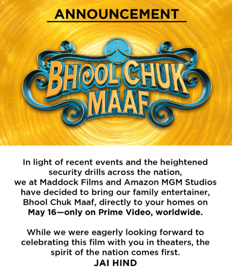 राजकुमार राव और वामिका गब्बी की बहुप्रतीक्षित फिल्म ‘भूल चुक माफ़’ अब बड़े पर्दे पर नहीं, बल्कि सीधे ओटीटी प्लेटफॉर्म पर रिलीज़ की जाएगी। भारत और पाकिस्तान के बीच बढ़ते तनाव और देशभर में सुरक्षा व्यवस्था की कड़ी निगरानी को देखते हुए, फिल्म के निर्माताओं ने इसका सिनेमाघरों में प्रदर्शन रद्द कर दिया है।