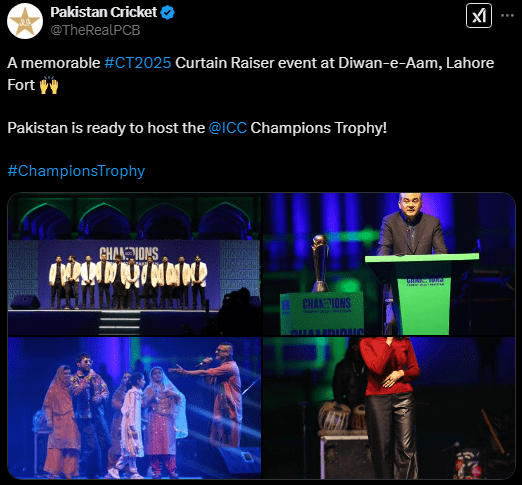 कर्टेन रेजर इवेंट के दौरान लाहौर किले को रोशनी से जगमग किया गया, जो इस बहुप्रतीक्षित टूर्नामेंट की झलक प्रस्तुत करता है। यह आयोजन 2017 के बाद पहली बार चैंपियंस ट्रॉफी की वापसी का संकेत देता है।