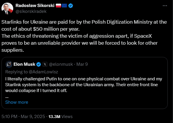 इस पर पोलिश विदेश मंत्री सिकोरस्की ने प्रतिक्रिया देते हुए दावा किया कि पोलैंड के डिजिटलीकरण मंत्रालय ने यूक्रेन को स्टारलिंक की सुविधा प्रदान करने के लिए हर साल लगभग 50 मिलियन डॉलर का भुगतान किया है। उन्होंने मस्क को फटकार लगाते हुए लिखा, “आक्रामकता के शिकार को धमकाने की नैतिकता के अलावा, अगर स्पेसएक्स एक अविश्वसनीय सेवा प्रदाता साबित होता है, तो हमें अन्य आपूर्तिकर्ताओं की तलाश करनी होगी।”