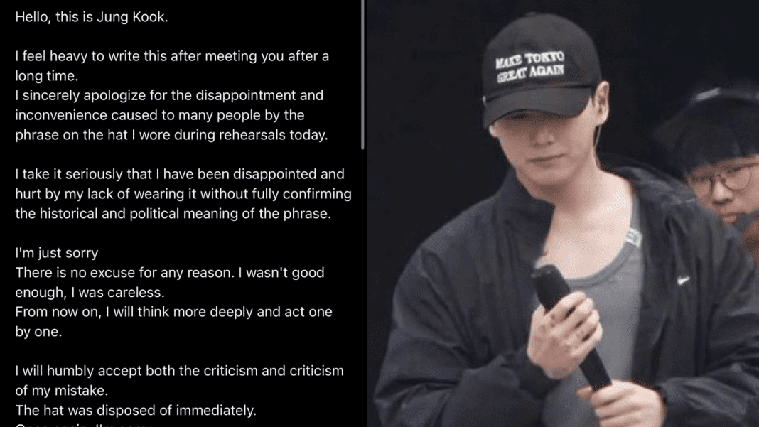 बीटीएस (BTS) के सदस्य Jungkook ने हाल ही में एक विवाद के बाद सार्वजनिक रूप से माफी मांगी है। यह विवाद उस समय खड़ा हुआ जब उन्होंने एक रिहर्सल के दौरान “मेक टोक्यो ग्रेट अगेन” (Make Tokyo Great Again) लिखा हुआ कैप पहन लिया। यह वाक्यांश अमेरिका के पूर्व राष्ट्रपति डोनाल्ड ट्रंप के प्रसिद्ध नारे “मेक अमेरिका ग्रेट अगेन” (Make America Great Again) की याद दिलाता है, जिसे कई लोग राजनीतिक और सांस्कृतिक रूप से संवेदनशील मानते हैं।
